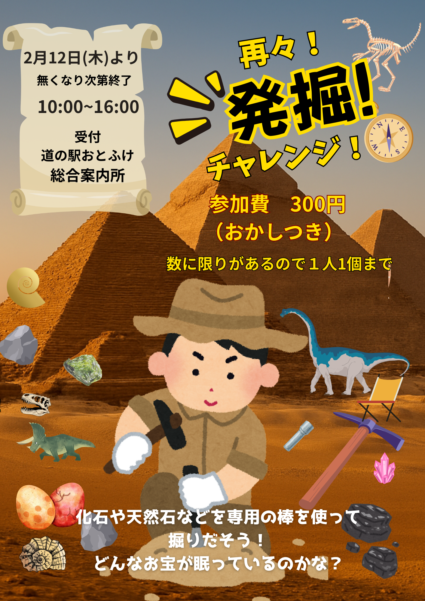 2月12日(木))より 発掘!再々!チャレンジ! 発掘 大好き キッズ 集まれ! 無くなり次第終了です!! 道の駅おとふけなつぞらのふる里 TEL:0155-65-0822(営業時間 9:00~18:00) …