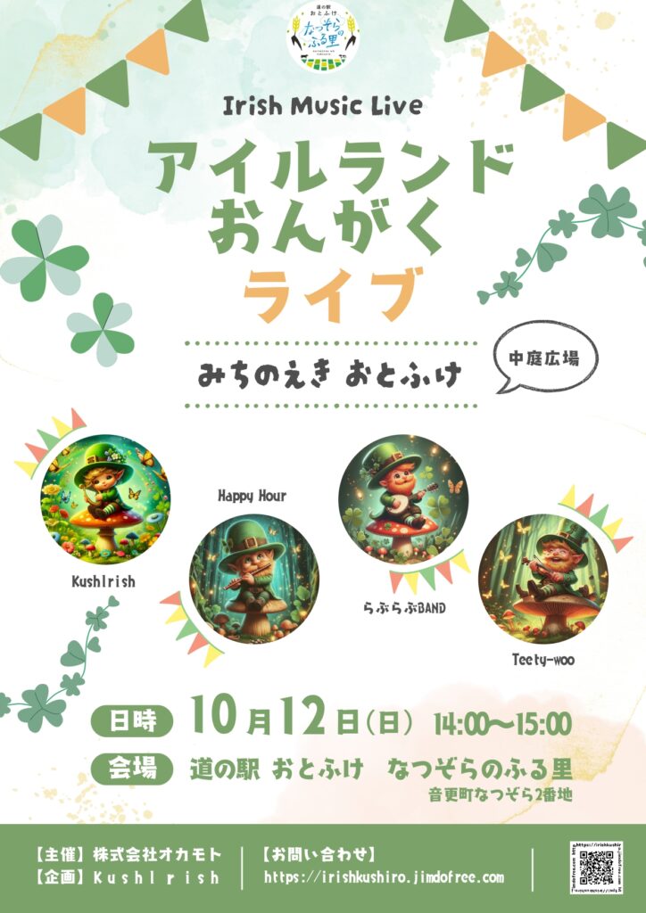 2025年10月1日 イベント 【10月12日(日)開催】アイルランド おんがくライブ ♦お問い合わせ 〒080-0346 音更町なつぞら2番地 TEL:0155-65-0822 (営業時間 9:00~19:00)