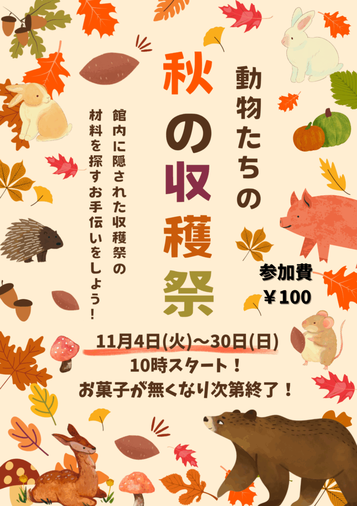 【11月4日からお菓子が無くなるまで】動物たちの秋の収穫祭~キッズイベント