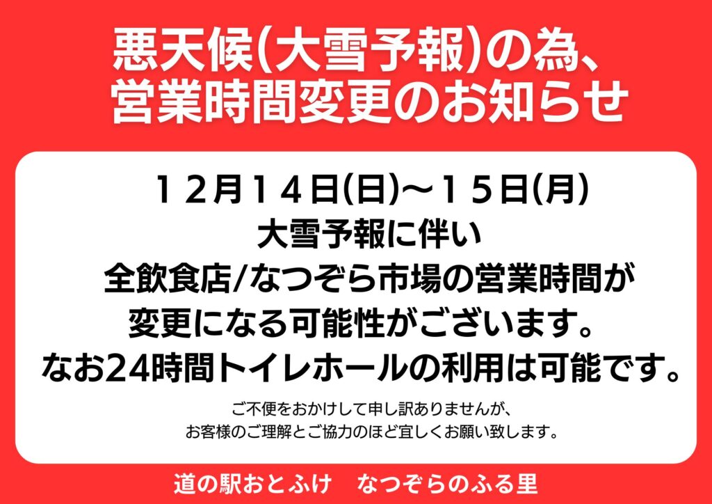 2025年12月14日 お知らせ 【重要なお知らせ】悪天候(大雪予報)の為、営業時間変更のお知らせ ♦お問い合わせ 〒080-0346 音更町なつぞら2番地 TEL:0155-65-0822 (営業時間 9:00~18:00) 【休館日】 年末年始