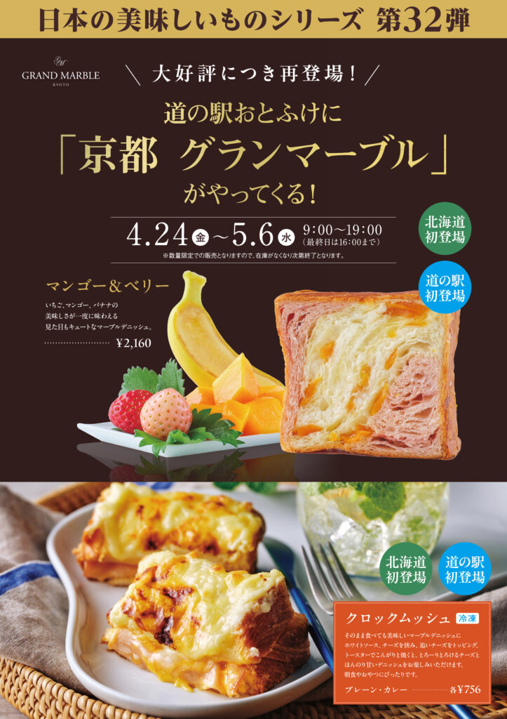 2026年4月20日 お知らせイベント 【日本の美味しいものシリーズ第32弾】4月24日(金)〜5月6日 (水)京都グランマーブル 〒080-0346 音更町なつぞら2番地 TEL:0155-65-0822 (営業時間 9:00~19:00)